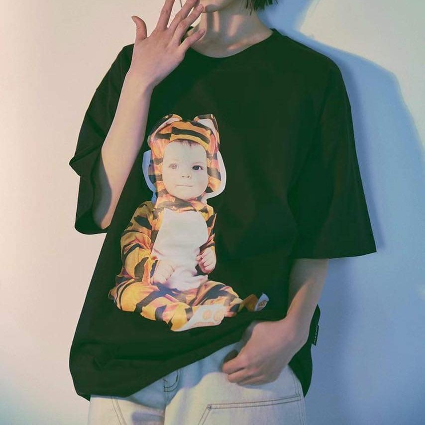 Phía trước áo được in hình khuôn mặt của một em bé xinh xắn, đang mặc bộ quần áo hổ có tai và đuôi, với biểu cảm ngây thơ và đáng yêu. Màu đen của áo tạo nên sự tương phản với hình in, giúp nổi bật hơn vẻ đẹp của áo. Áo có form rộng unisex, phù hợp với cả nam và nữ, có thể kết hợp với nhiều loại quần áo khác nhau.