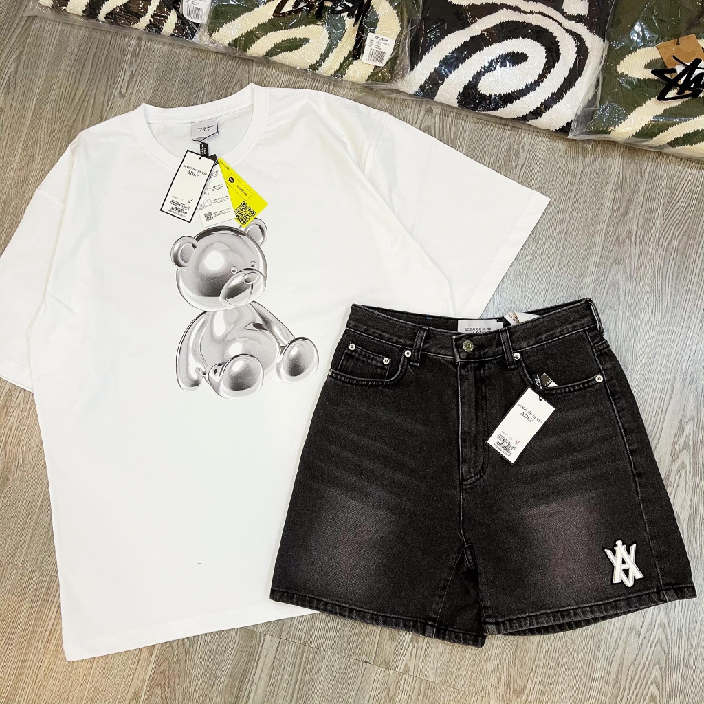 - Áo có hình gấu màu xanh blue và tên thương hiệu phía trước và sau áo tạo điểm nhấn tinh tế.