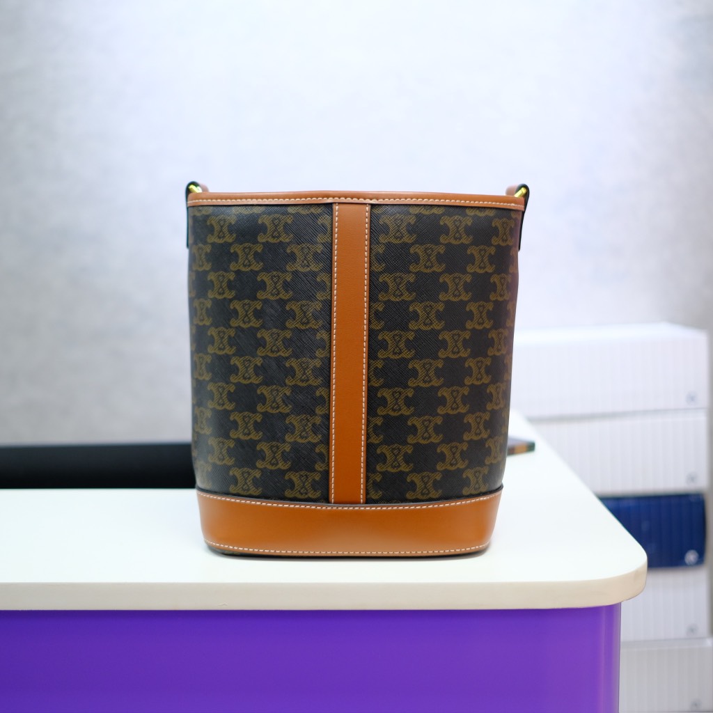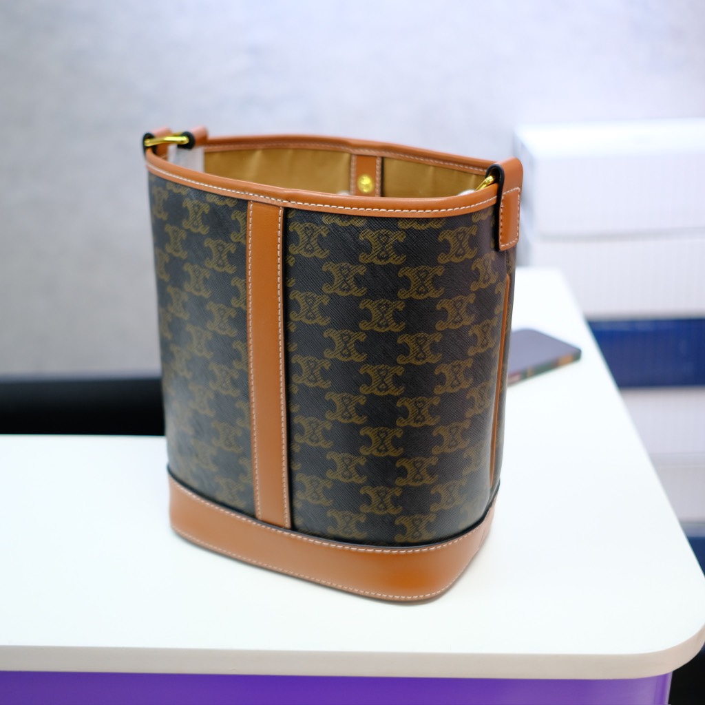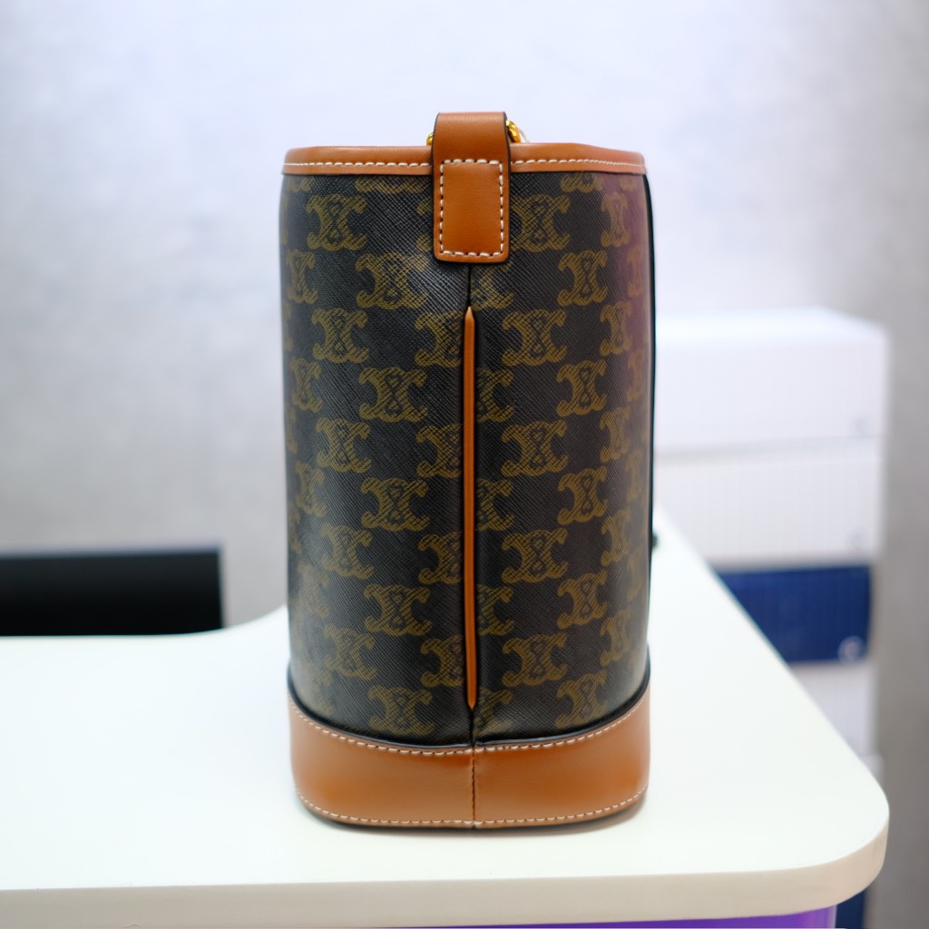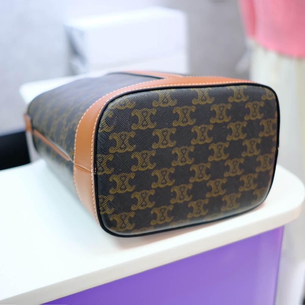 Giỏ xách Bucket Trompie mang đến phong cách tối giản nhưng đầy ấn tượng. Phần thân túi được làm từ chất liệu canvas cao cấp, kết hợp cùng đường viền và quai xách da bò tự nhiên, tạo nên vẻ ngoài thanh lịch và bền bỉ. Logo Celine được in nổi bật phía trước, giúp tăng thêm nét thời trang và đẳng cấp.