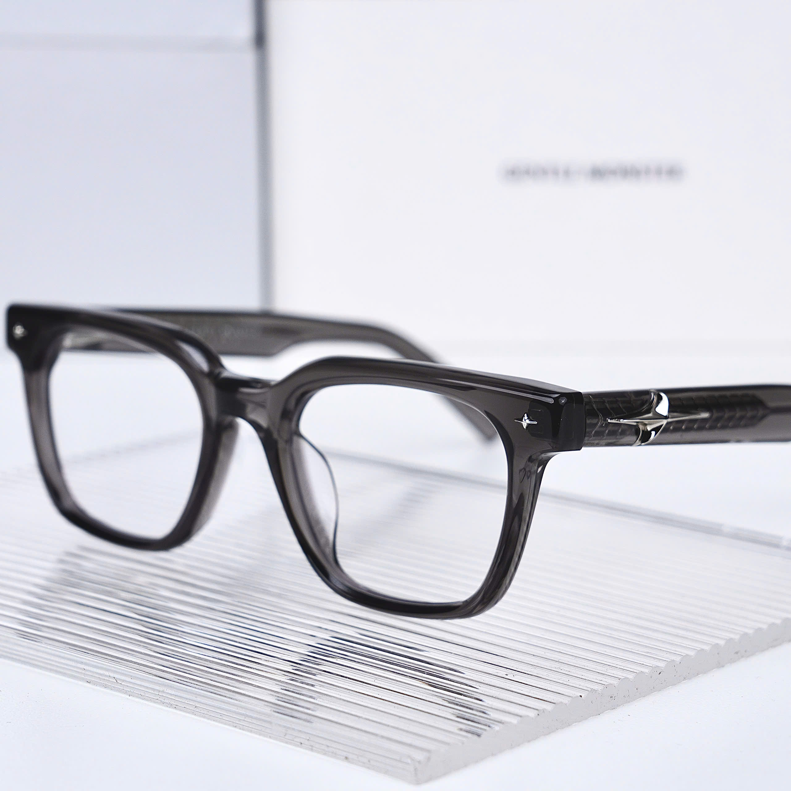 Gọng kính được làm từ acetate cao cấp màu xám trong, có độ bền tốt và bề mặt mịn sang trọng. Chất liệu này vừa chắc chắn vừa nhẹ, mang lại cảm giác thoải mái khi sử dụng trong thời gian dài. Tròng kính có khả năng chặn ánh sáng xanh và ngăn tới 99,9% tia UV, giúp bảo vệ mắt khi sử dụng ngoài trời. Các chi tiết bản lề và logo được gia công tỉ mỉ, thể hiện độ hoàn thiện cao của sản phẩm.