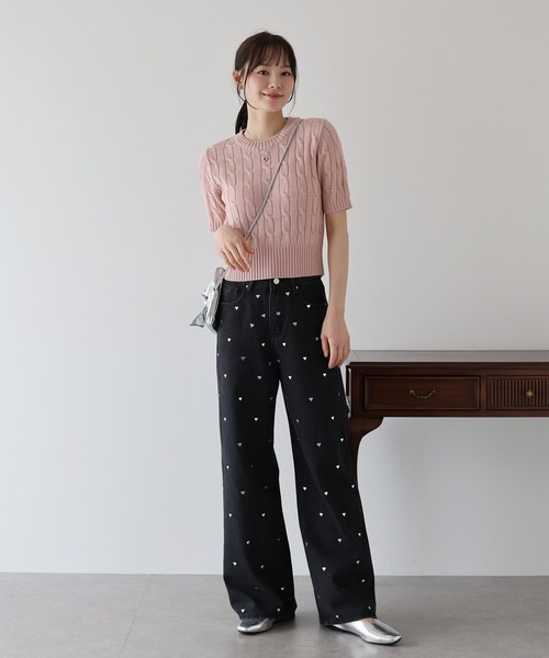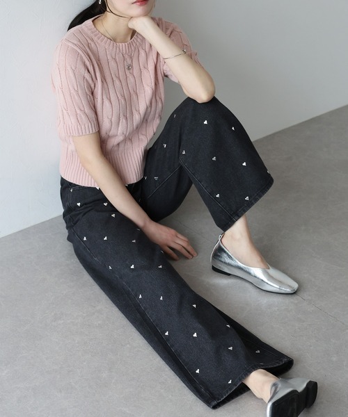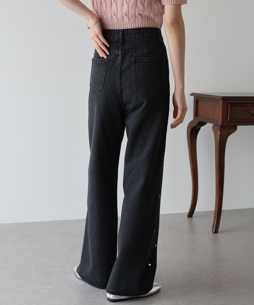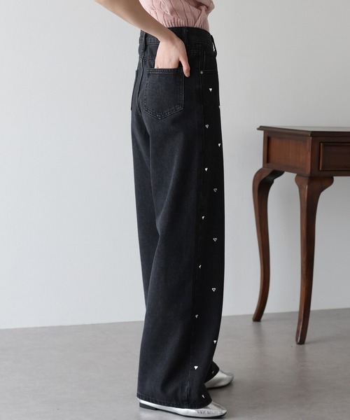 Quần bò đen đính trái tim mang phong cách trẻ trung, hiện đại với phom suông nhẹ hoặc baggy dễ mặc. Điểm nhấn là họa tiết trái tim được thêu hoặc đính tinh tế, tạo cảm giác nữ tính nhưng vẫn giữ được sự cá tính, độc đáo.