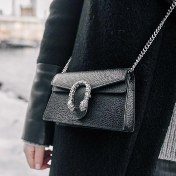 - Khóa kim loại hình đầu chó sói trang trí mặt trước, là biểu tượng đặc trưng của dòng túi Dionysus.