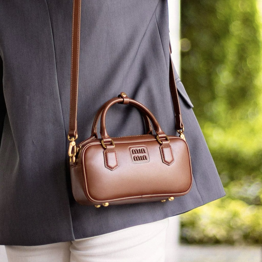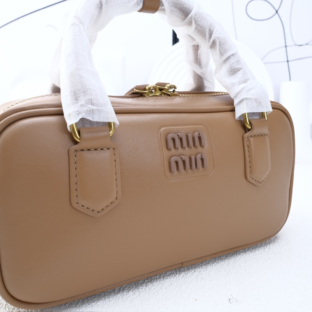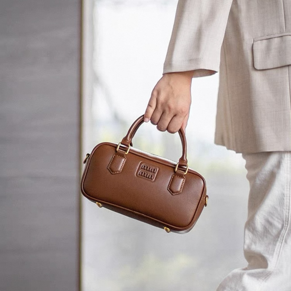 Quai xách cứng cáp, phối cùng logo Miu Miu mạ kim loại sáng bóng phía trước – nổi bật nhưng không phô trương.