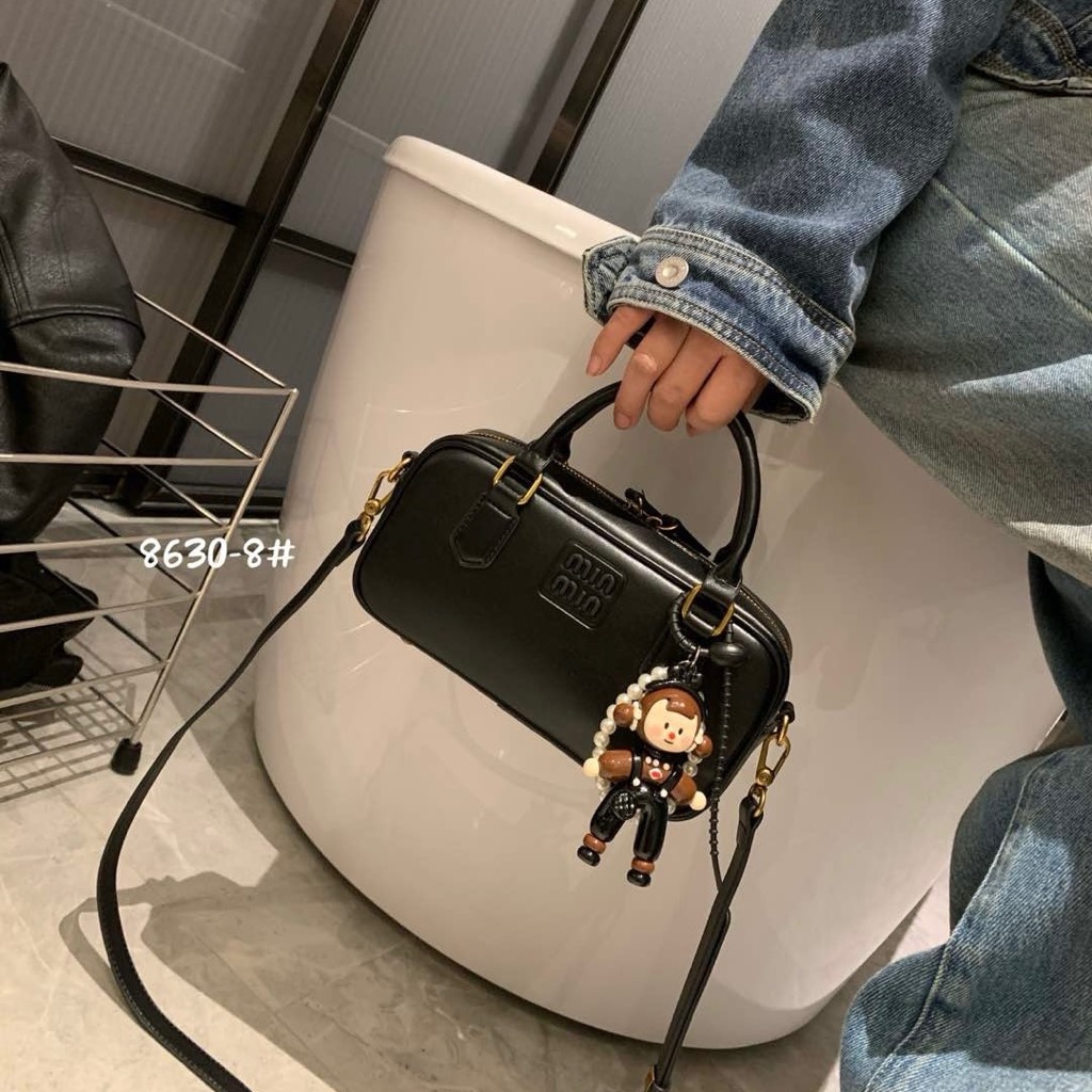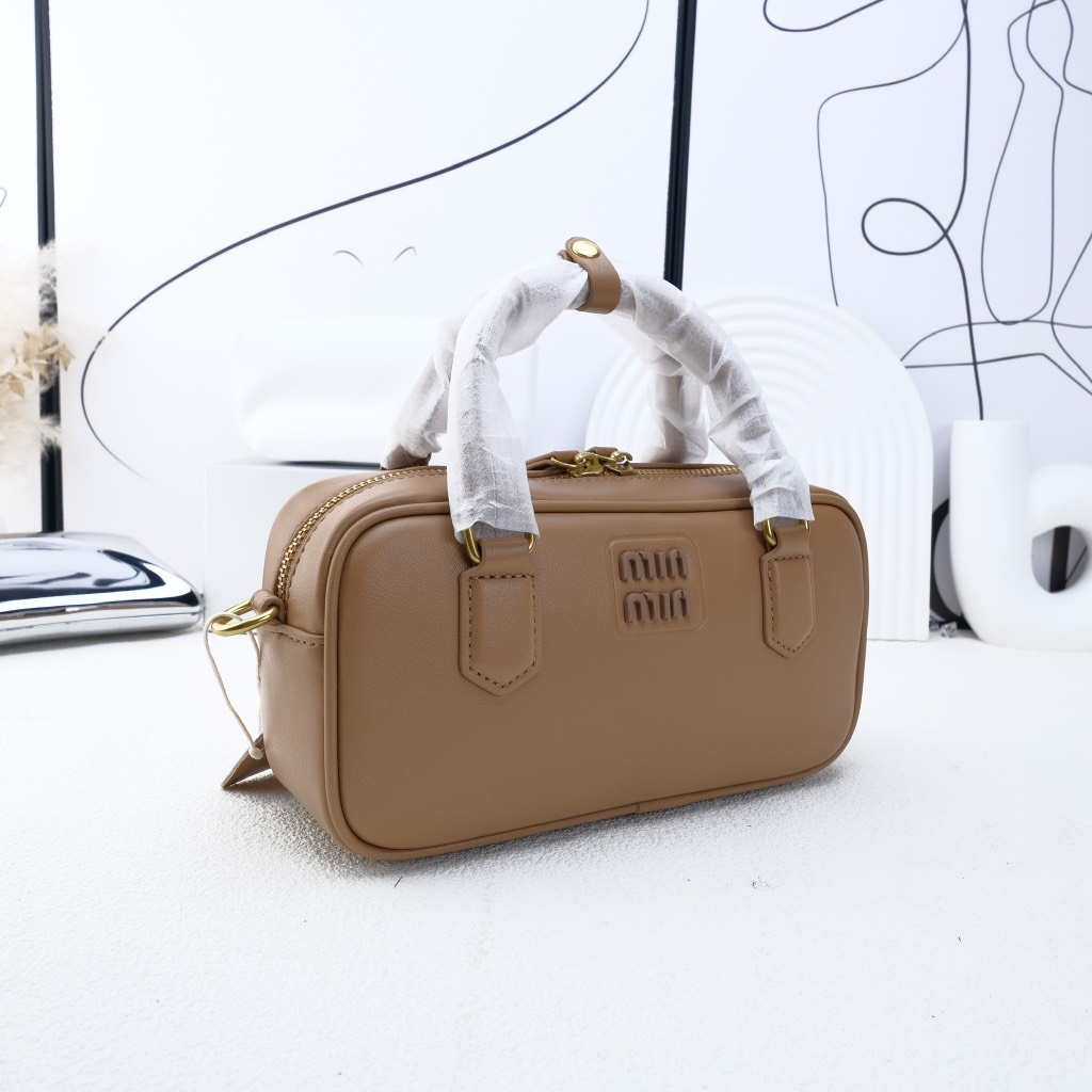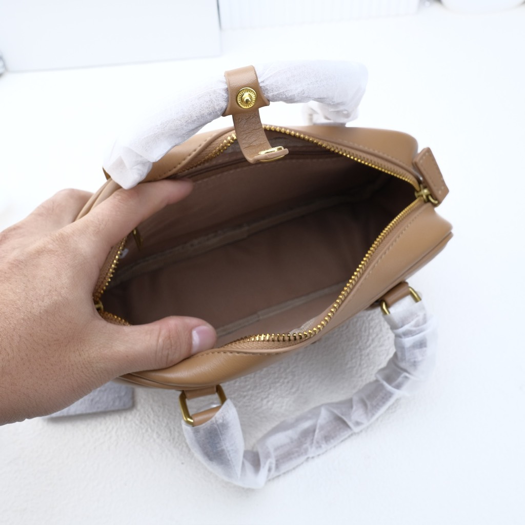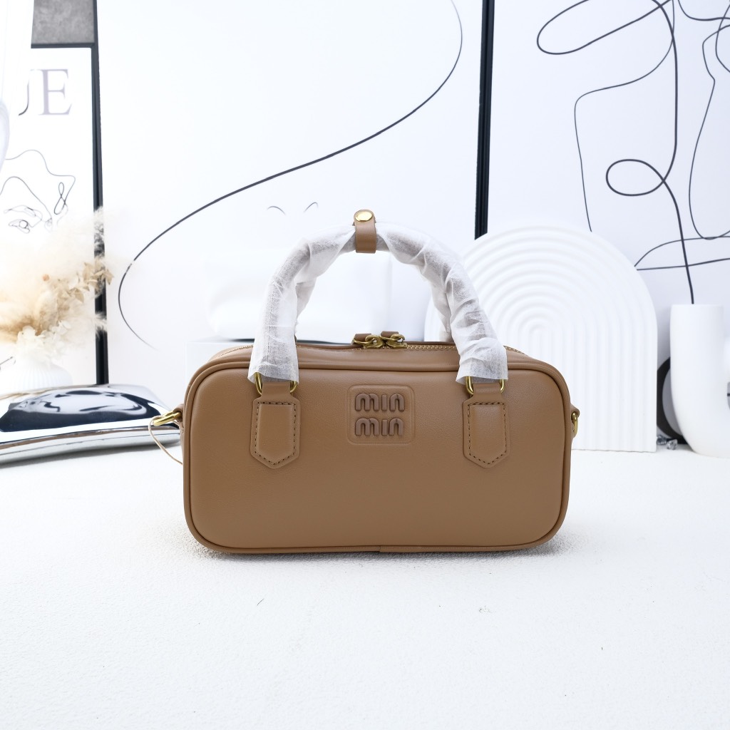 Quai xách cứng cáp, phối cùng logo Miu Miu mạ kim loại sáng bóng phía trước – nổi bật nhưng không phô trương.